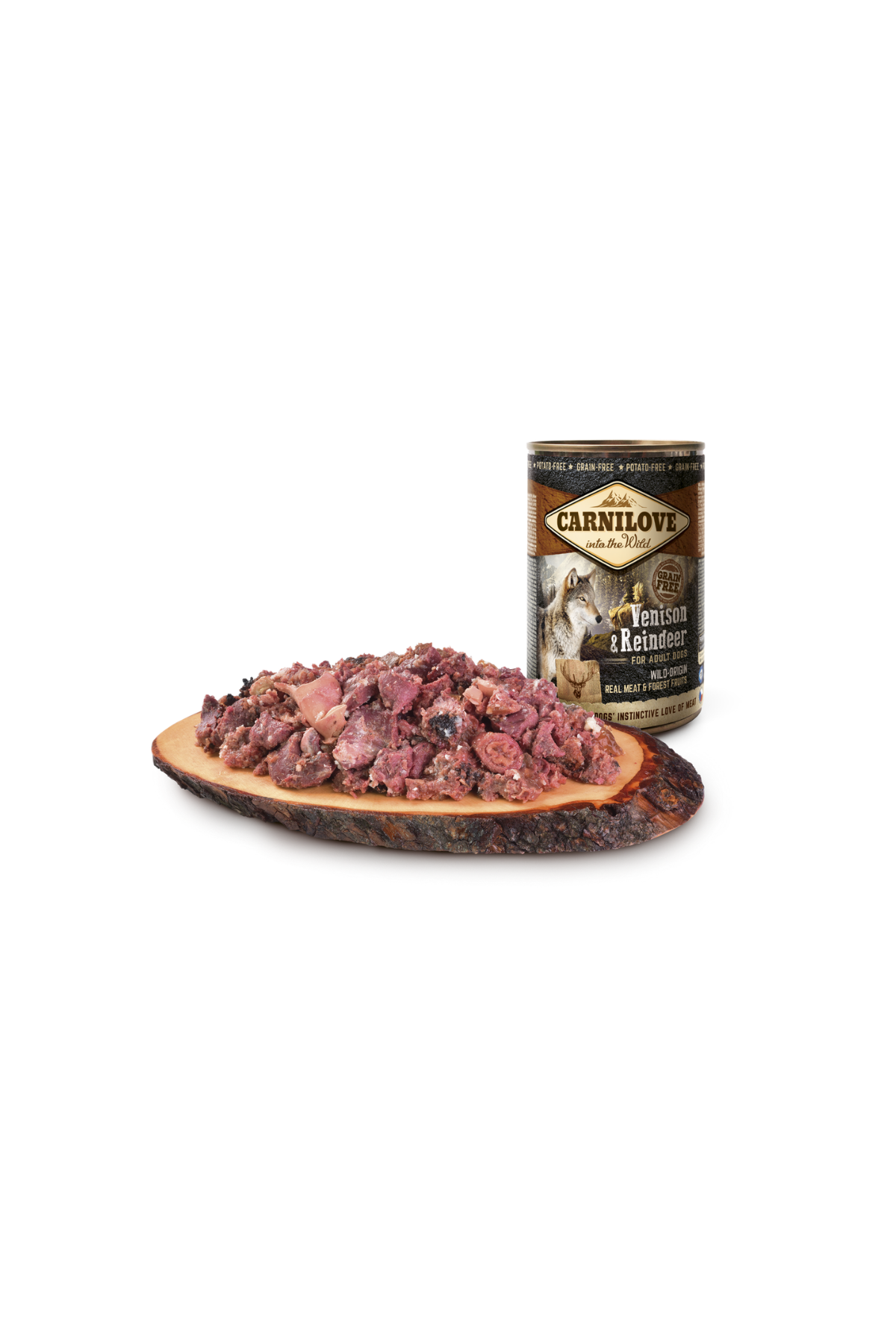 Yetişkin köpekler için yüksek et içerikli ve tahılsız ezme. Geyikli ve Ren geyikli komple köpek yaş maması.