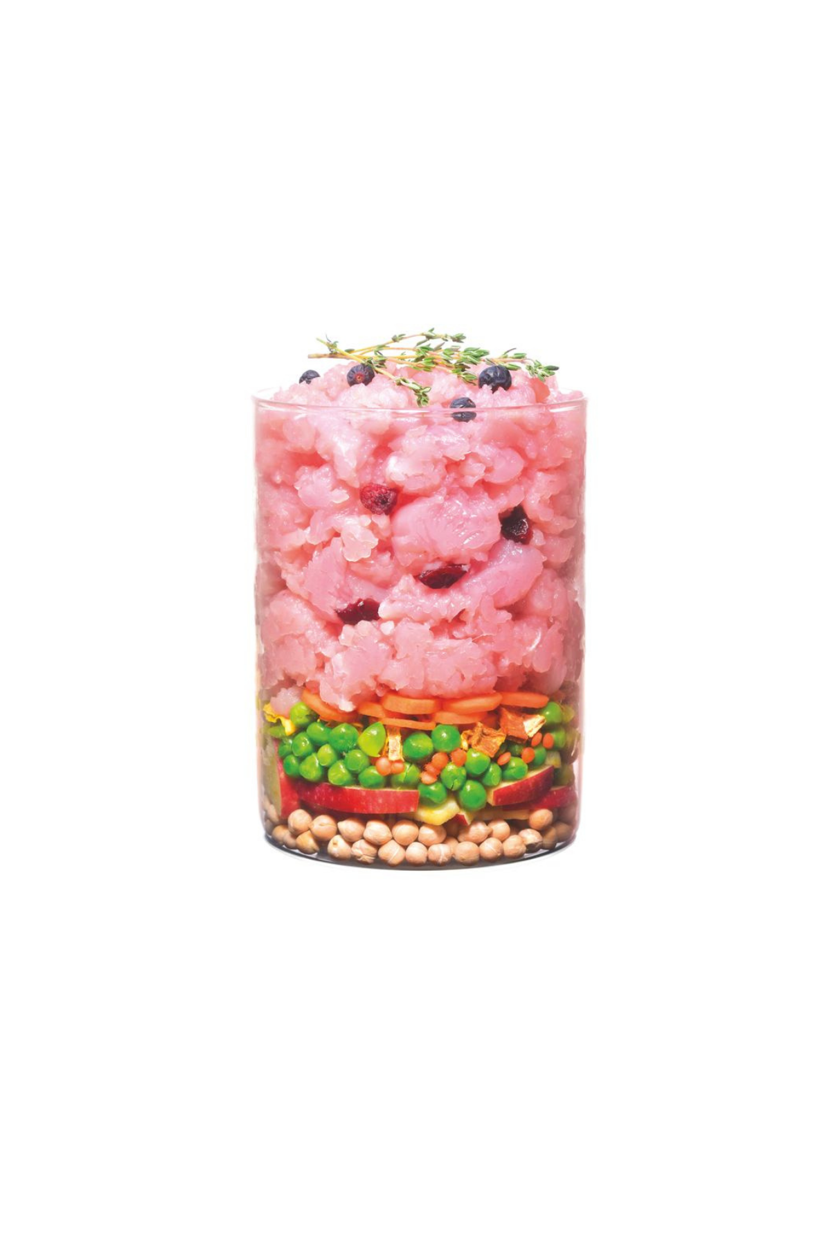 Taze hindi eti (%60), bezelye, tavuk yağı (tokoferollerle korunmuş), nohut, kurutulmuş elma, kırmızı mercimek (%4), balkabağı, somon yağı (%2), havuç, kurutulmuş yumurta kabukları, su mercimeği (%0,5), spirulina (%0,3), kurutulmuş yer iğdesi (%0,2), kurutulmuş zencefil kökü (%0,1), kurutulmuş yaban mersini (%0,1), kurutulmuş biberiye (%0,1), kurutulmuş kızılcık (%0,1), kurutulmuş kekik (%0,1), glukozamin (%0,026%), yeşil dudaklı midye (%0,025%), kondroitin sülfat (%0,016%), bira mayası (mannan-oligosakkarit kaynağı, %0,015%), hindiba kökü (frukto-oligosakkarit kaynağı, %0,01%), Mojave yuka (%0,01%).
