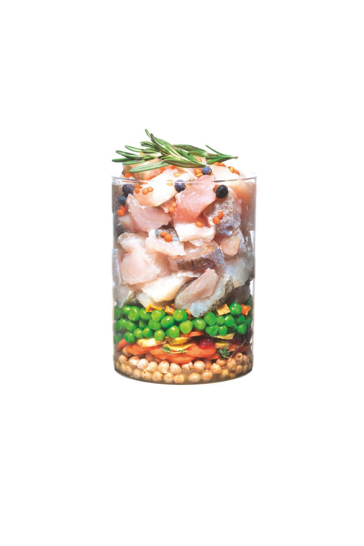 Taze balık (%60), bezelye, tavuk yağı (tokoferollerle korunmuş), nohut (%4), kurutulmuş elma (%4), kırmızı mercimek, balkabağı, somon yağı (%3), havuç, kurutulmuş yumurta kabukları, su mercimeği proteini (%0,5), spirulina (%0,3), kurutulmuş yer iğdesi (%0,2), kurutulmuş zencefil kökü (%0,1), kurutulmuş yaban mersini (%0,1), kurutulmuş biberiye (%0,1), kurutulmuş kızılcık (%0,1), kurutulmuş kekik (%0,1), glukozamin (%0,026%), yeşil dudaklı midye (%0,025%), kondroitin sülfat (%0,016%), bira mayası (mannan-oligosakkarit kaynağı, %0,015%), hindiba kökü (frukto-oligosakkarit kaynağı, %0,01%), Mojave yuka (%0,01%).